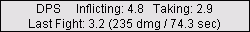 DPS MeterThe DPS Meter shows your Damage Per Second while you are fighting, as well as the damage you are taking. It also shows your total for the last fight. The example above shows that right now you are doing 4.8 dps and taking 2.9 dps. This is updated in real-time as you fight. During your last battle you did a total of 235 damage over 74.3 seconds for a DPS of 3.2. Your current DPS is the sum of your damage for the last 10 seconds divided by 10 seconds. The same method is used to calculate the damage taken. Using the DPS MeterThe DPS meter appears in the Alert window while you are fighting, and stays visible for a short time after a fight. It stays hidden at other times to minimize clutter. For the DPS Meter to appear: